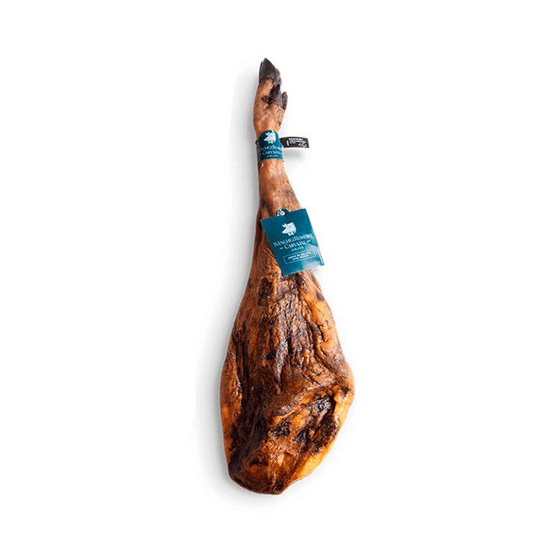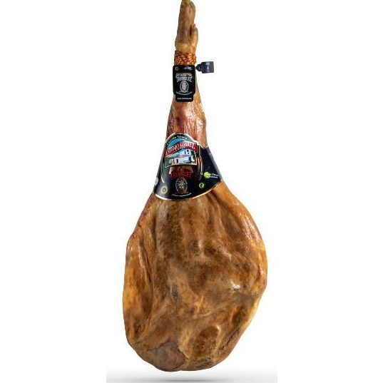 Jamón procedente de cerdo ibérico, criados en libertad y con pienso controlado, sin aditivos. Curación mínima de 24 meses.