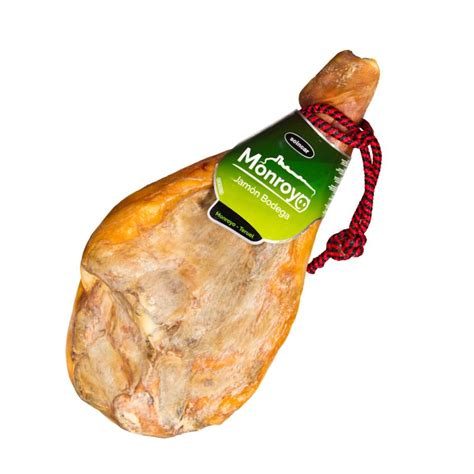 Jamón procedente de cerdo ibérico, criados en libertad, en las dehesas, en la temporada de montanera, se alimentan de bellotas. Curación mínima de 24 meses.